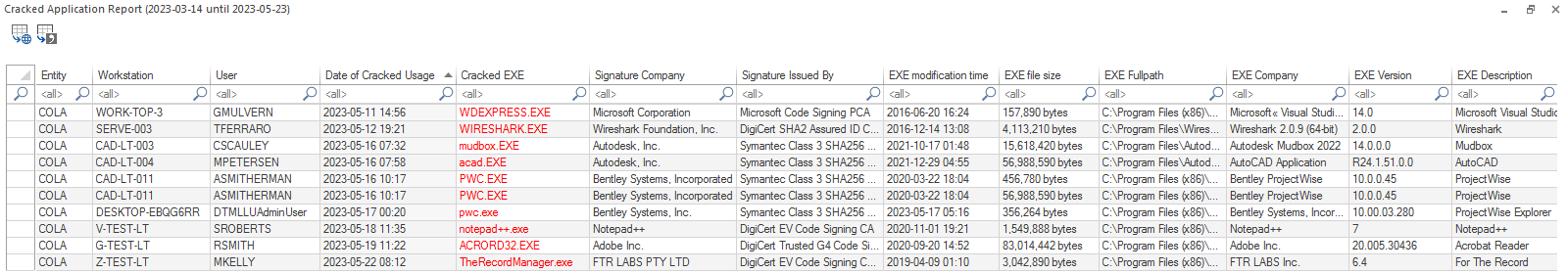 SofTrack Managed Assets automatically detects each application used where its digital certificate fails to confirm the integrity and originality of the application, indicating it has been cracked/modified. You will also learn of each application being engaged that is not digitally signed by its creator.