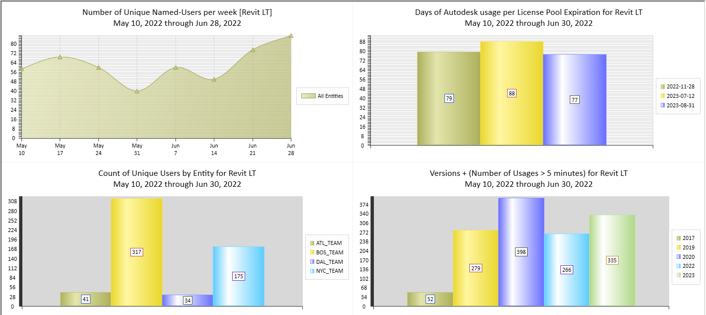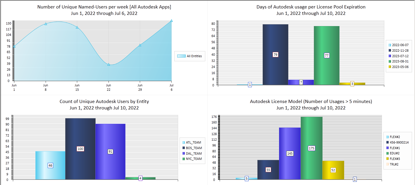 The following image shows 4 activity charts for a specific Autodesk® application.
