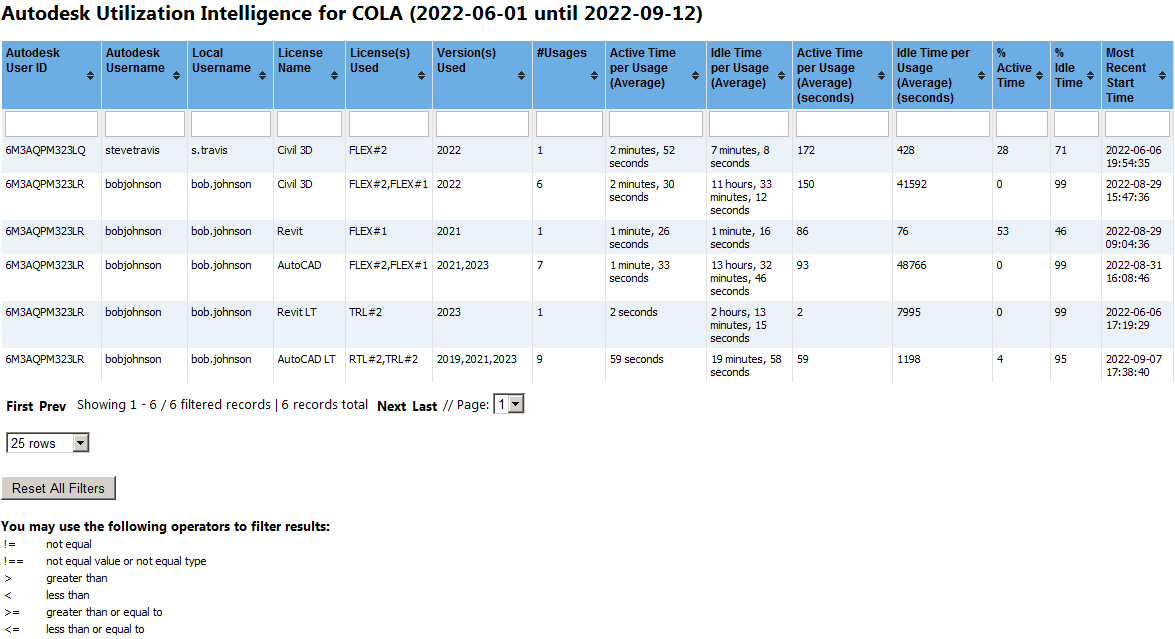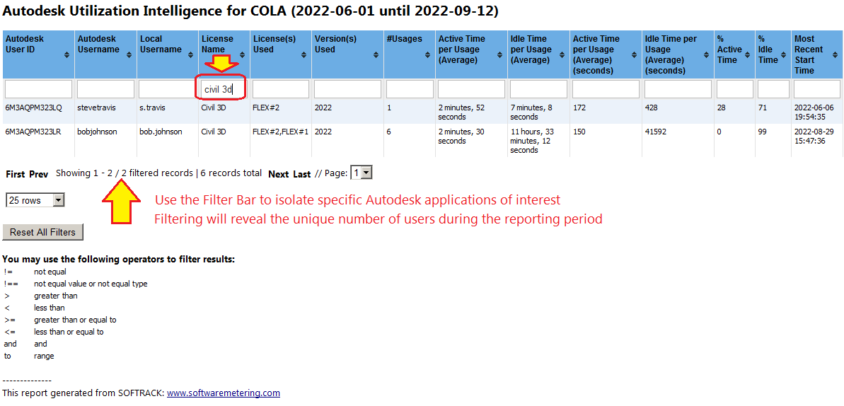The following image shows how to use filters to determine the number of Autodesk® users per License.