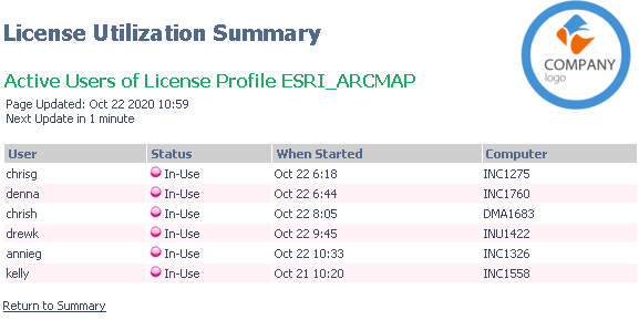 • Enables real-time webpage view that users can access to know where ESRI® licenses are in-use